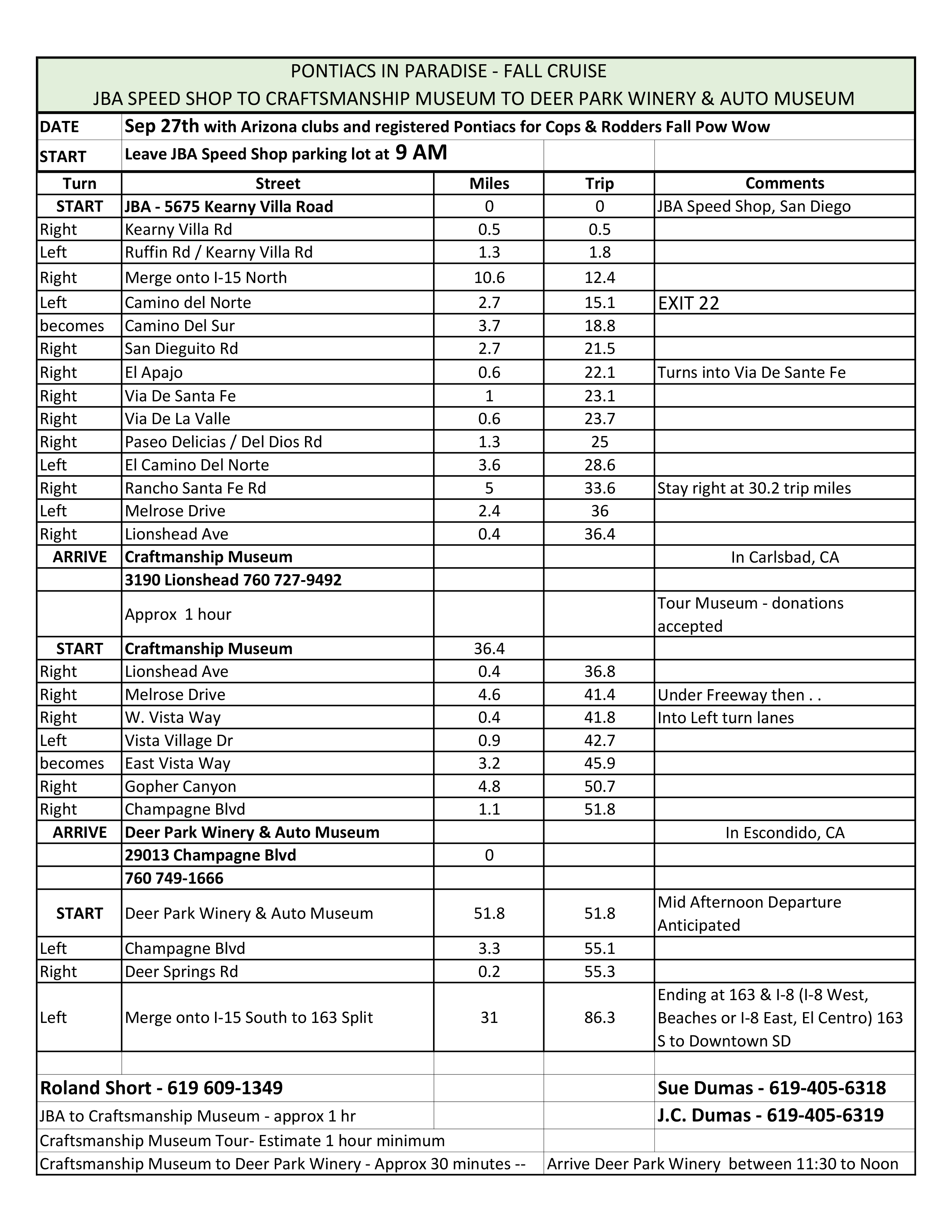 We would like to invite all of you that registered with a Pontiac for the Cops & Rodders Fall Pow Wow to join us for a pre-show day cruise. The cruise was created for all of us Ponti-yackers to get together for a scenic cruise to north county. The cruise is planned for Saturday, September 27th, beginning at 9:00 a.m. until mid-afternoon. Please see that attached with all the details about the cruise destinations and what we'll be doing. Also, attached are the cruising directions done in great detail for the total of 86-mile round trip cruise. We would love to see all those Pontiacs parked on the grass up at Deer Park Winery & Auto Museum in Escondido. We wanted to welcome our Arizona Pontiac Chapter members and show them a piece of San Diego on this scenic cruise. All Pontiac owners and club members are encouraged to join us for an all-Pontiacs cruise and fun mini car show. Please reply to me only and let me know if you are planning to attend, and how many people in your car. This will help us for planning purposes. Keep on Cruising, Sue Dumas, Club President, (619) 405-6318 J.C. Dumas, Show Chairman (619) 405-6319 Roland Short, Activities Chairman (619) 609-1349 Jim Thomson, Newsletter Editor (858) 203-5490